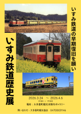 いすみ鉄道は、沿線地域をはじめ近隣市町の高校生の足として、また観光振興の面でも、重要な役割を担っている鉄道です。一昨年の脱線事故以来運休が続いており、現在バスにて代行運行していますが、早期の復旧を願って、いすみ鉄道歴史展を以下の通り開催します。